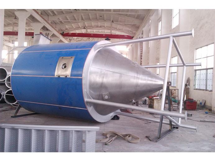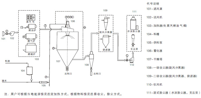 氛圍經由進程過濾器和加熱器,進入枯燥器頂部氛圍分派器,熱氛圍呈螺旋狀平均地進入枯燥器。料液由料液槽顛末濾器由泵送至枯燥器的離心霧化器,使料液噴成極小的霧狀液滴,料液與熱氛圍并流打仗,水分敏捷蒸發,在極短的時候內枯燥為制品。制品由枯燥塔底部和旋風分手器中排擠,廢氣由風機排擠。